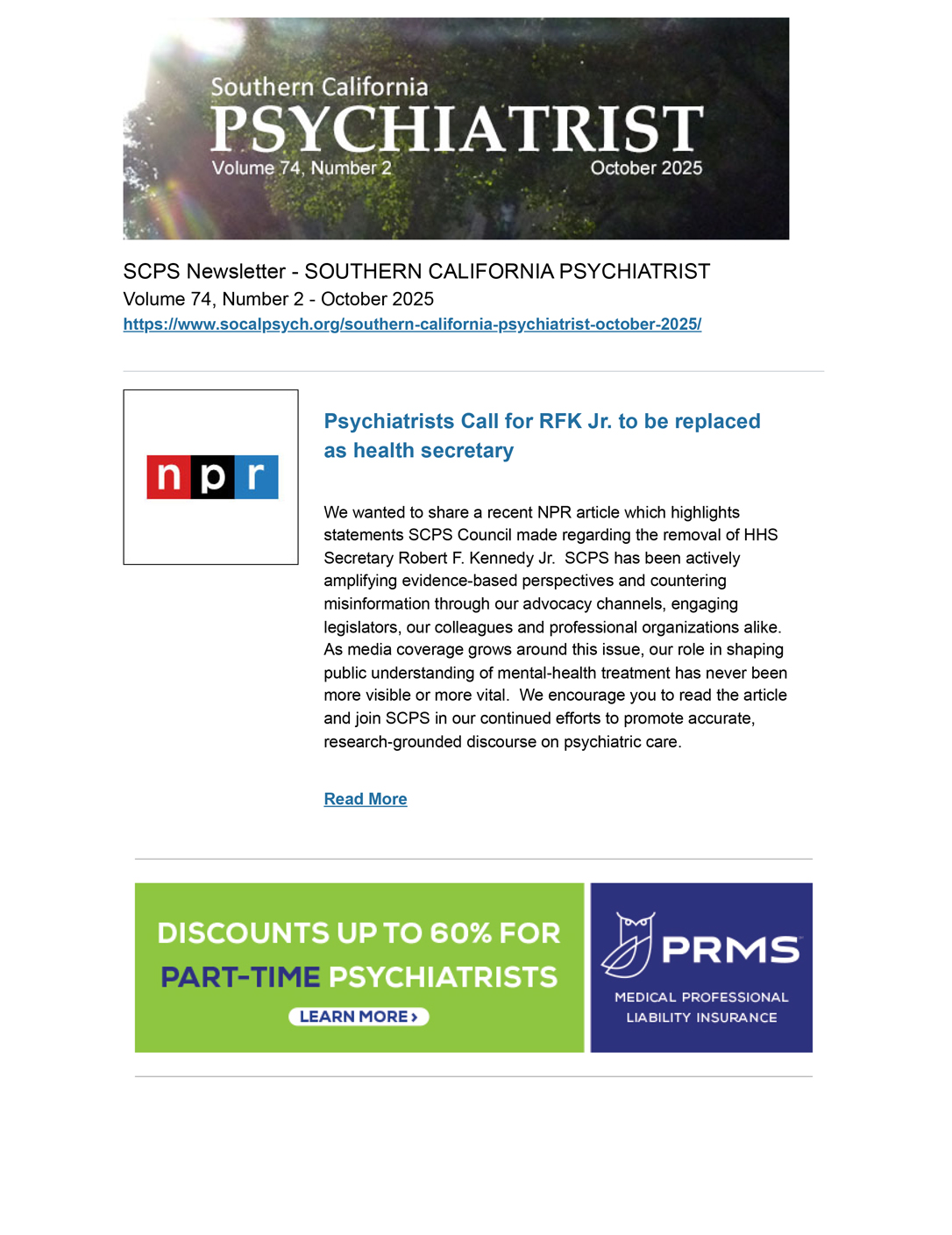 The Southern California Psychiatric Society, representing more than 1000 psychiatrists in the region, calls on the California congressional representatives and senators who represent our members to urge the California congressional delegation and the Senate Mental Health Caucus led by California Senator Alex Padilla to seek removal of Robert F. Kennedy, Jr. as Secretary of the Department of Health and Human Services. Secretary Kennedy has repeatedly spread dangerous falsehoods about medical preventative services and treatments.